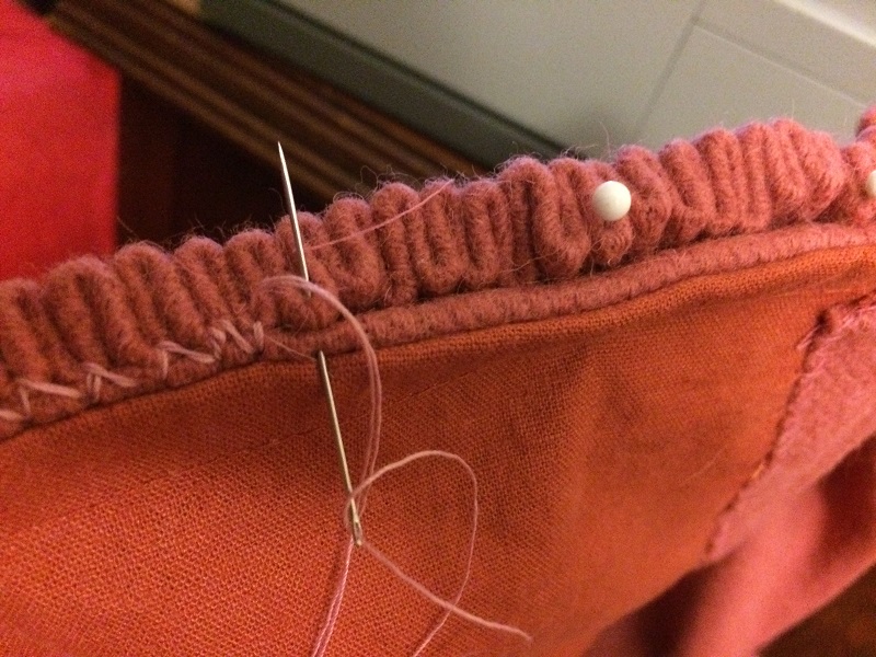 Madder/pink wool kirtle with cotton twill lining, has synthetic cable tie bones in the