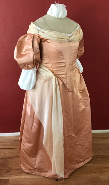 Peach silk satin boned bodice with puffy sleeves laces up back. Sheer gold trim on neckline with tail at end held in place with