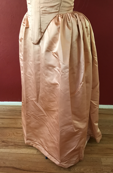 Peach silk satin skirt with narrow waistband, pleats over bum roll, and closes with hooks and eyes.