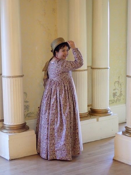 Lavender printed cotton with purple poly cotton lining fastens at front with hooks and eyes and has covered buttons on front and at sleeve cuffs. Skirt was bag lined and gathered to bodice. Edges and seams were prick stitched to keep lining from showing.