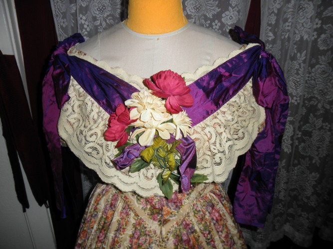 with cap sleeves, lace and purple silk bertha ties on shoulders.