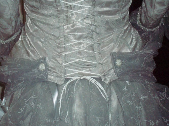 | BowEmbroidered gray polyester organza and gray lace ribbon can be tied to the bodice apron with gray satin ribbons.