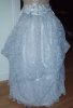 | UnderskirtGray jacquard satin acetate front gored underskirt has larger panel in the back that is gathered in back for more fullness and has hidden back pockets, ribbon drawstring on set waistband, back hook and eye closure. Gray lace on bottom edge with two rows of gray satin ribbon.Pattern base Simplicity 5457. |