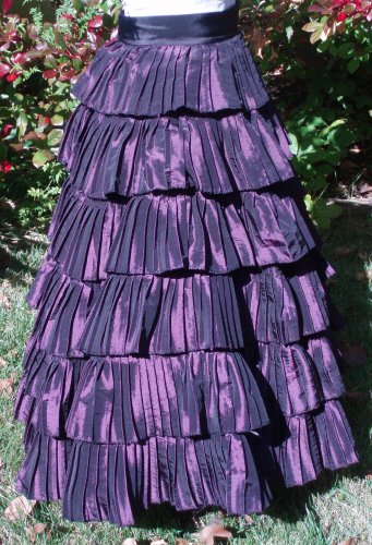 | SkirtPurple polyester taffeta, pleated onto black polyester taffeta circle skirt. Slightly gathered into black waistband, 3 hook and eye back closure, hidden side pockets. |
