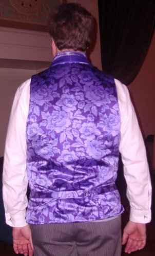 Purple flowered printed satin waistcoat and cravat for Gaskell's and possibly Dicken's Fair.