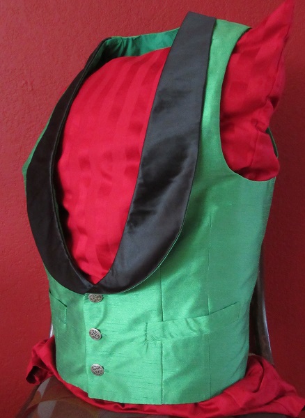 Green faux (synthetic) silk dupioni waistcoat with deep black polyester satin