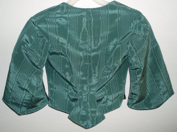Mock bodice in green moire taffeta with pagoda sleeves lined with gray satin.