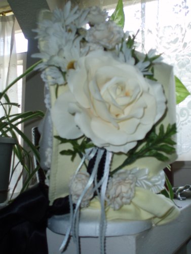 black grossgrain ribbon ties. Shown plain and decorated with purchased flowers and