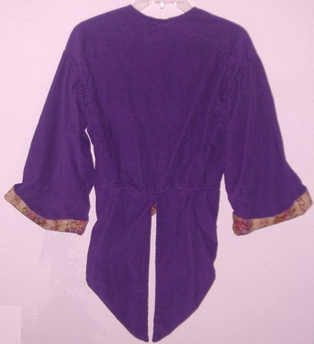 Dicken's dress. Purple corderoy bodice with purple skirt. Model photos are of a previous incarnation without buttons and tails.
