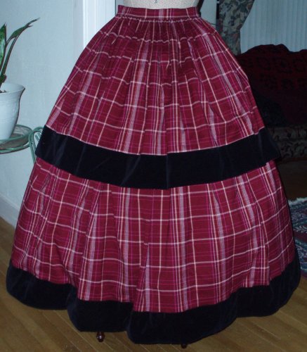 Dicken's skirt with burgandy plaid suiting fabric and two layers.