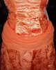 | UnderskirtOrange polyester satin with rope pattern front gored underskirt has larger panel in the back that is gathered in back for more fullness and has hidden back pockets, ribbon drawstring on set waistband, back hook and eye closure. Orange pleated polyester ruffle with orange grossgrain ribbon trim covering gathers.Pattern base Simplicity 5457. Circumference 102" |