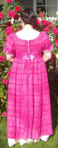 Hot pink polyester Regency style dress with gathered sleeves and bodice.