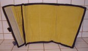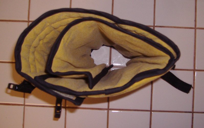 Stilt bindings for wood stilts. Padded twill with velcro and straps with plastic clip enclosures. Leg goes on the inside with a layer of padding/twill then outside covers the wood. Will try to look for original design drawing.
