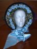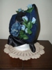 Straw bonnet covered with dark blue polyester suede with black lace front, black 4" ribbon, white floral on inside brim, and blue roses.