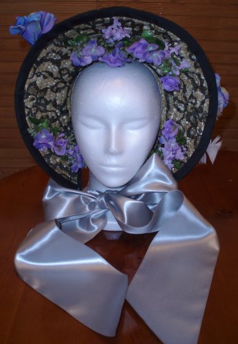 Straw bonnet covered with charcoal gray/black cotton velvet with black lace front, silver 4" ribbon, white feathers, blue/purple flowers, and purple floral on the inside brim.