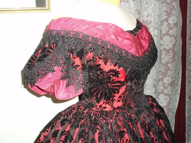 back burgandy satin ribbon lacing through buttonholes, burgandy moire polyester taffetta bertha with black lace on bottom hem, puffed sleeves, bodice fabric