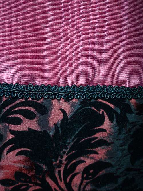 Burgandy polyester taffeta with black velvet print overskirt sewn to burgandy moire polyester taffeta underskirt and cartridge pleated into set waistband. Has back