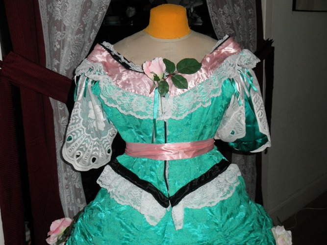 Teal synthetic brocade bodice with pink satin pleated bertha, piped in black satin, white ruffled lace on