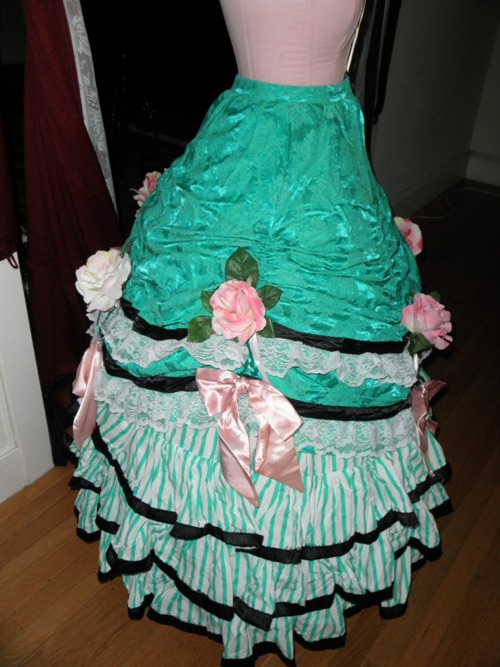 small hoopskirt for a fuller look. Dressform was too large so bodice is pinned to it and is smaller.