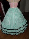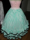 Teal and white striped cotton gathered skirt with drawstring waistband and three flounces with black polyester satin trim.