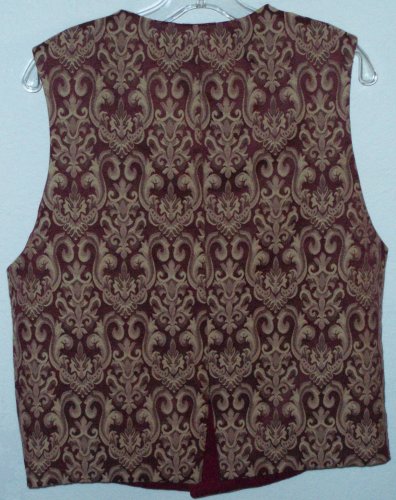 Burgandy brocade with same fabric on collar, cotton lining, fashion buttons.